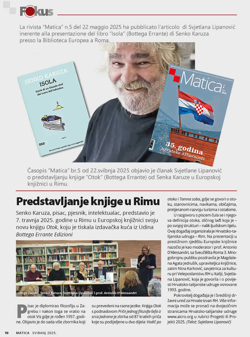La rivista "Matica" n.5 del 22 maggio 2025 ha pubblicato l'articolo di Svjetlana Lipanović inerente alla presentazione del libro "Isola" (Bottega Errante)di Senko Karuza presso la Biblioteca Europea a Roma.