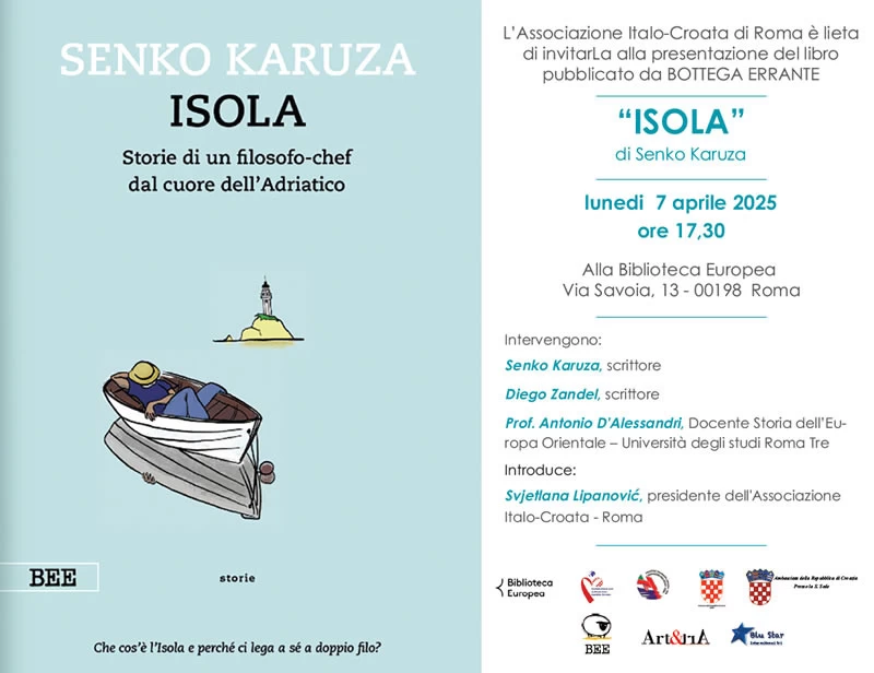 Senko Karuza, scrittore, poeta e intellettuale croato ha presentato il Suo libro “Isola” – tradotto egregiamente da Ginevra Pugliese e, pubblicato dalla Casa Editrice “Bottega Errante Edizioni” – il 07 aprile 2025 presso la Biblioteca Europea a Roma. Lo scrittore si è laureato in filosofia a Zagabria e, in seguito si è ritirato sull’isola di Vis, dove è nato nel 1957. Ha pubblicato otto raccolte di racconti e due sillogi, tradotte in diverse lingue straniere. Il libro “Isola” con il sottotitolo “Storie di un filosofo-chef dal cuore dell’Adriatico – è una” raccolta di 87 racconti che si dividono in due parti: “Guida all’isola” e “Camera obscura” che trattano l’isola, la sua gente e i suoi usi e costumi, lo sviluppo spesso esagerato del turismo ed altro…
