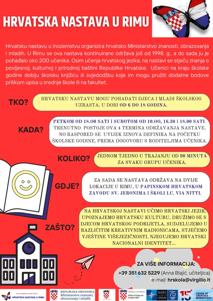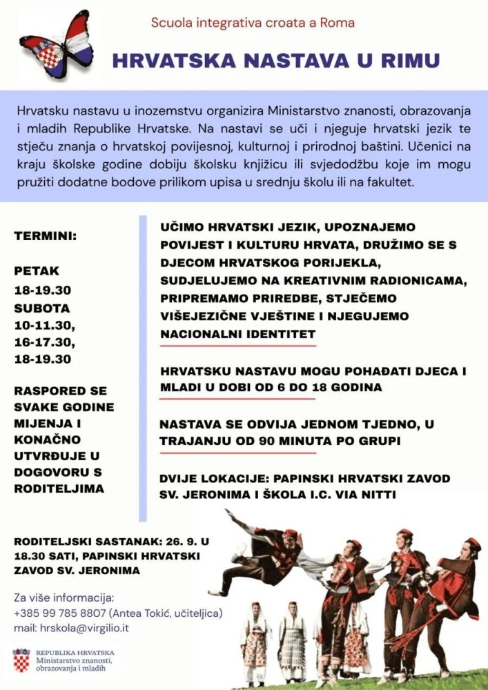 Hrvatsko-talijanska udruga uputila je 1998. godine Ministarstvu znanosti i obrazovanja RH u Zagrebu molbu za dozvolu otvaranja “Hrvatske dopunske škole”, namijenjene djeci naših sunarodnjaka u Rimu.